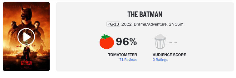 #新蝙蝠侠开分# 爆了!《新蝙蝠侠》口碑解禁,烂番茄新鲜度高达96%。